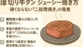 {{画像:プロが教える、フライパンで焼いた肉厚な牛タンのイメージ。レモンとネギ塩を添えて}}